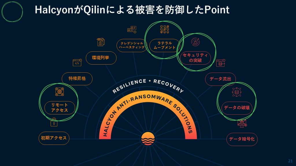 セミナーでは、米国の金融機関で発生したインシデント対応事例を紹介しました。このケースは、話題となっているランサムウェアグループQilinによる攻撃を完全に防御した実例となります。Qilinは、既存のEPP/EDRを回避してランサムウェアが30台のホストに侵入しましたが、HalcyonのRDRチーム(専門のセキュリティチーム)がリモートアクセスの試みを即時に検知・ブロックし、暗号化が行われる前に被害を食い止めることに成功しました。また、万が一、暗号化が発生した場合でも、Halcyonの復号機能により、数時間での業務復旧が高い確率で可能となる点が強調すべきポイントです。