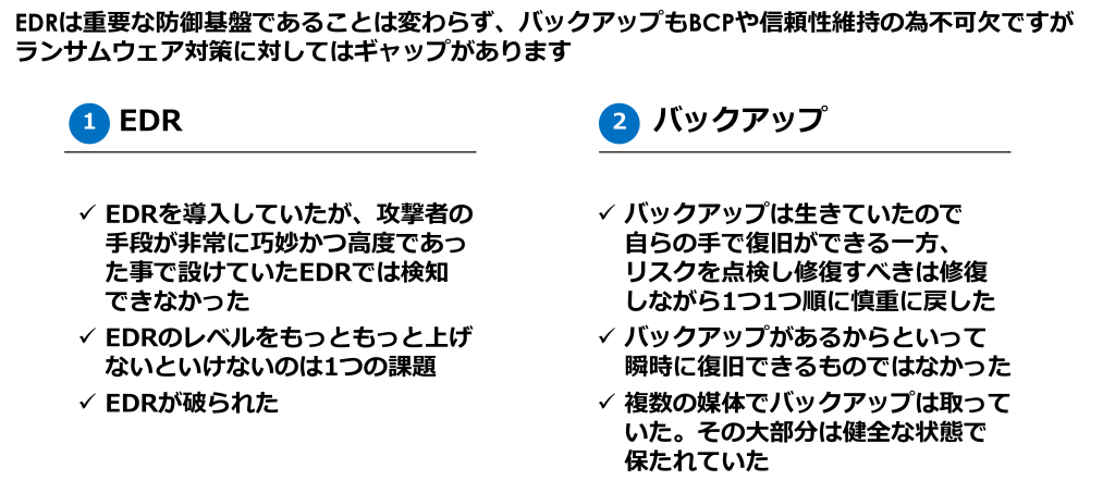 1. ランサムウェア脅威の深刻化:インシデントの規模・影響が拡大しており、EDRをはじめとするエンドポイントセキュリティ導入や、バックアップ取得といった従来の対策だけでは不十分
