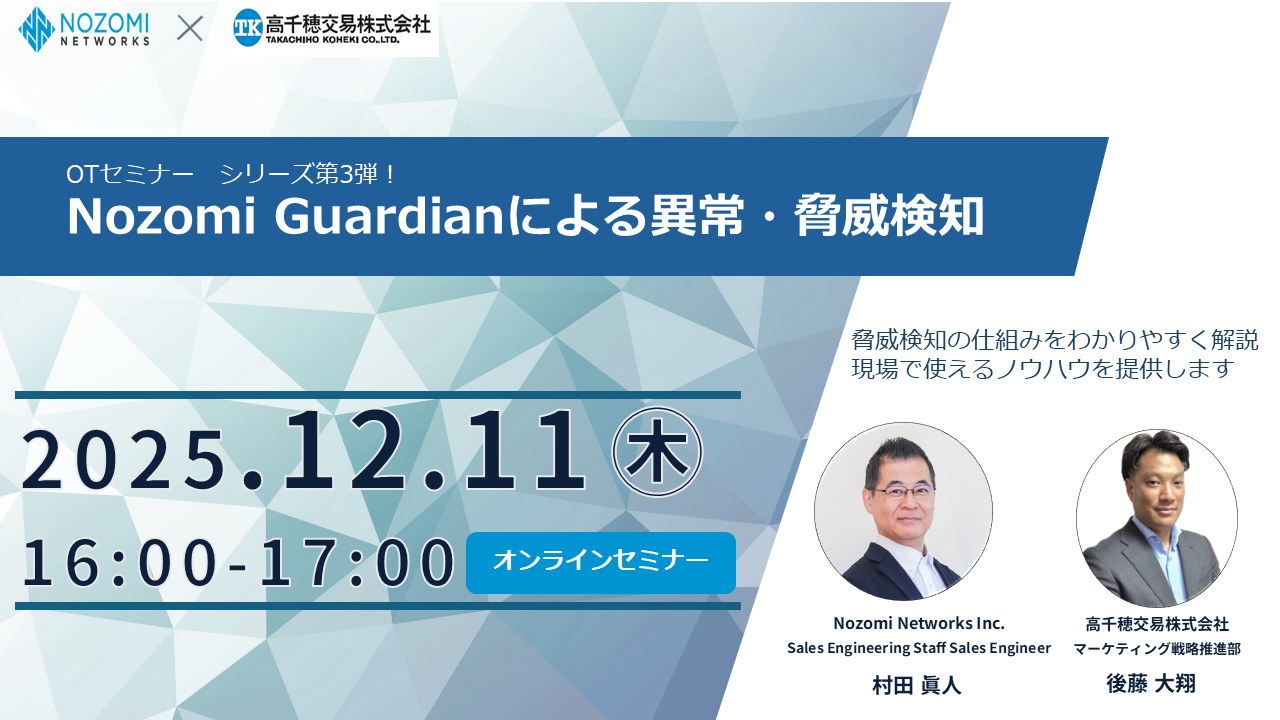 本セミナーでは、待望のWebinarシリーズ第3弾(第1回2025/8/28㈭開催/第2回2025/11/13㈭開催)として、OT/IoTセキュリティの重要性と実践的な対策を学べる場を提供します。もちろん、本セッションからご参加でもご理解いただける内容です。