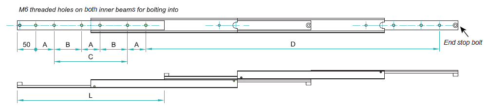 PART No. | レングス L | トラベル D | A | B | C | 耐荷重 (kg/ 組) |