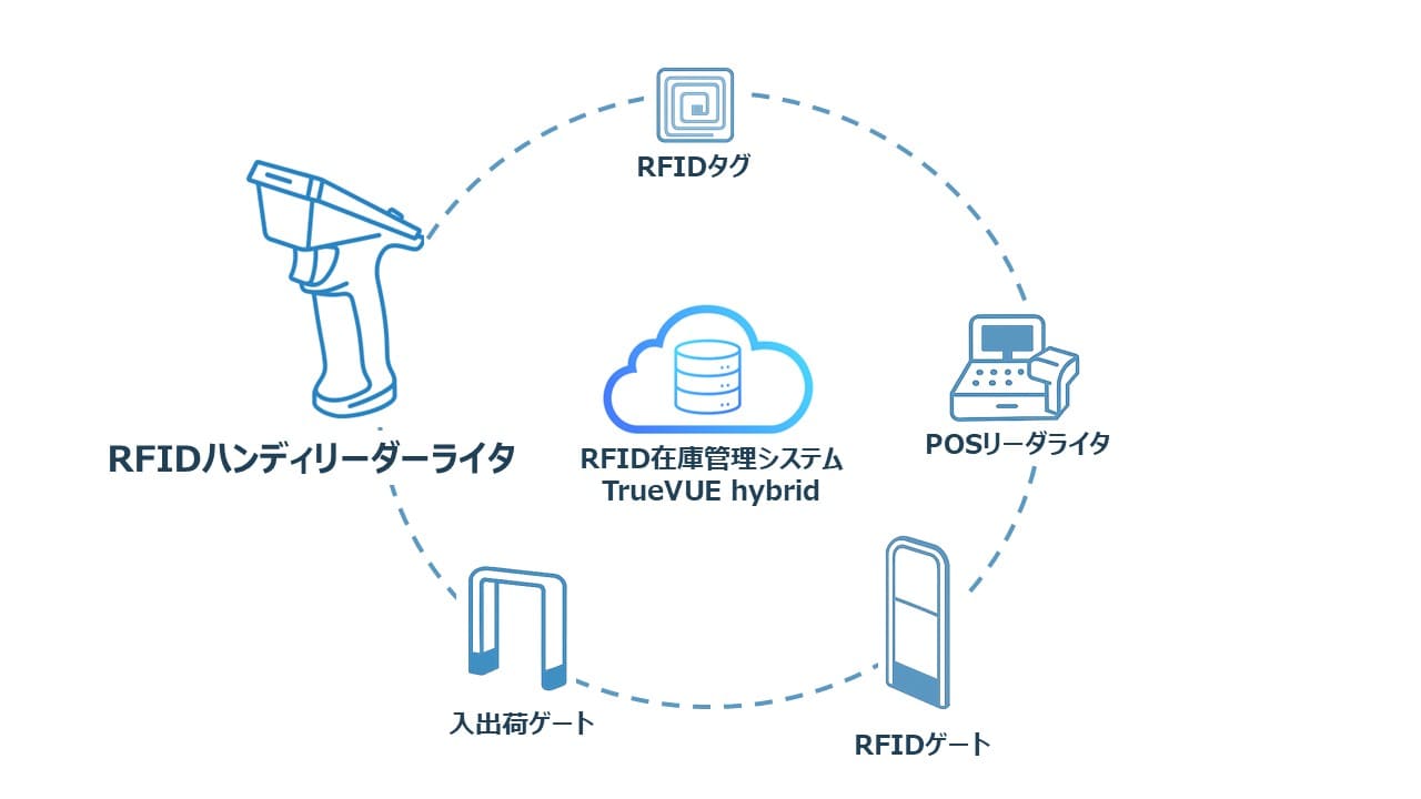 RFIDハンディリーダライタで読み取った在庫情報を、RFID在庫管理システム『TrueVUE hybrid(トゥルーヴューハイブリッド)』を利用し、そのままクラウドや基幹システムへリアルタイム連携*。店舗・倉庫・工場の在庫データを最新状態で統合でき、欠品・過剰在庫の早期発見や補充精度の向上につながります。企業のサプライチェーン最適化を強力に後押しいたします。