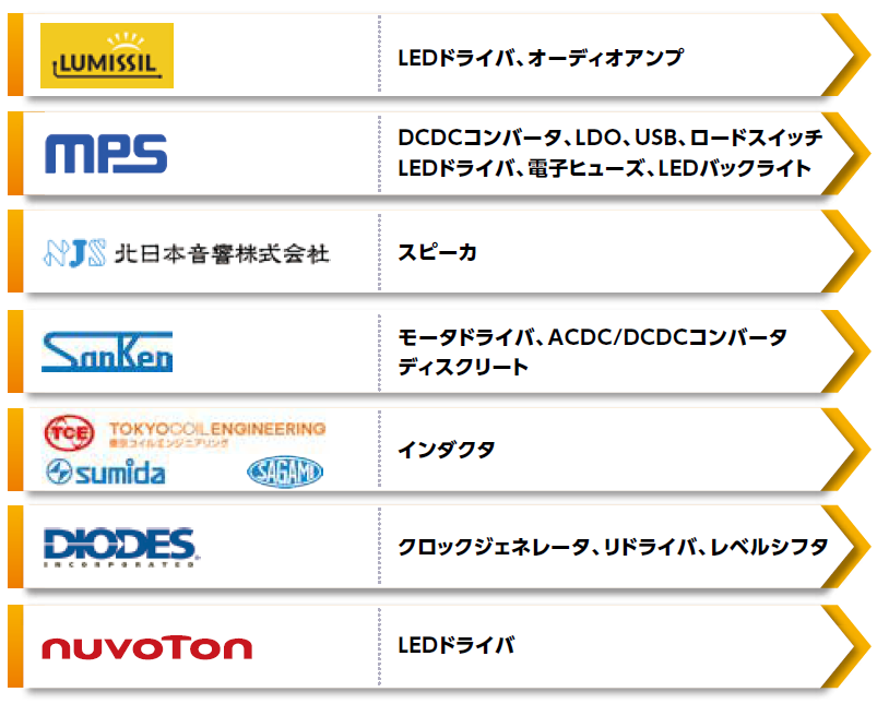 ・ISSI ・北日本音響 ・サンケン電気 ・スミダコーポレーション ・Diodes Incorporated ・東京コイルエンジニアリング